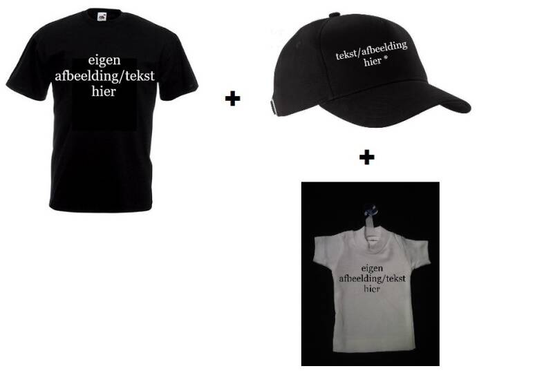 Personaliseer een t-shirt, cap of mini-shirt met je eigen tekst/afbeelding